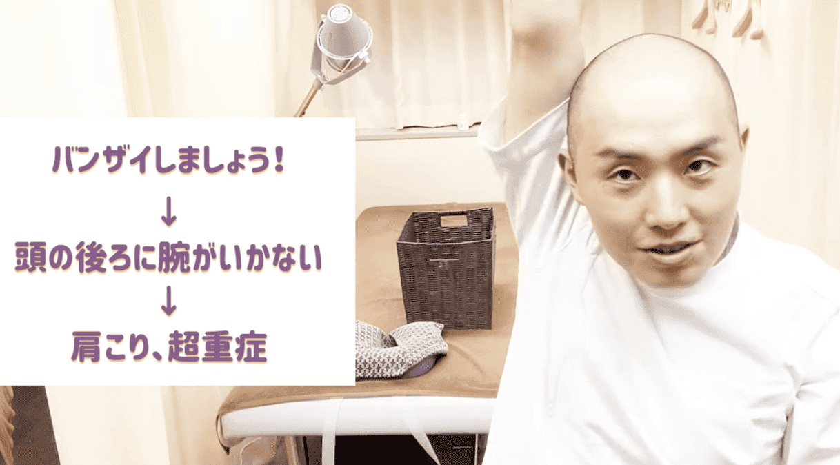②バンザイして腕が耳にくっつくかを見ます。腕がスムーズに頭の後ろくらいにまでいかないといけません。腕が痛くて耳にくっつかない人は揉んでも改善しない辛い肩こりです。