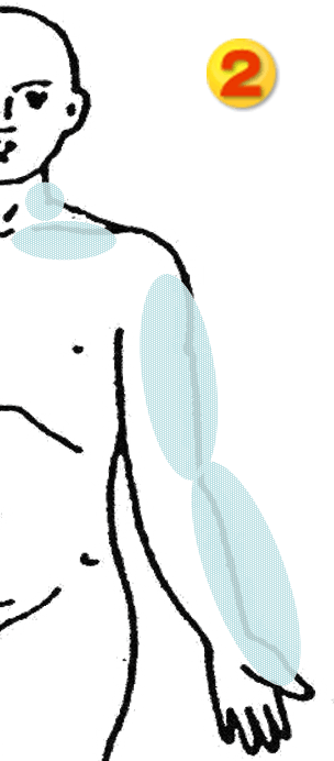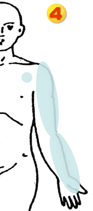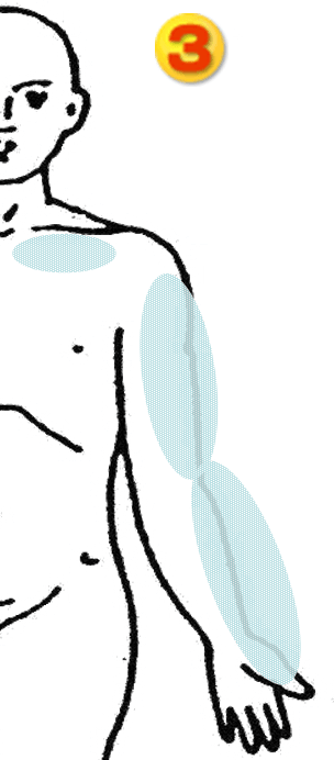 腕や手を動かす神経そして動脈は、鎖骨の下をくぐり、胸の筋肉を貫通し、肩、腕と通り、指の先まで行きます。そこがなんらかの原因で硬くなり神経を圧迫し痛みを起こします。