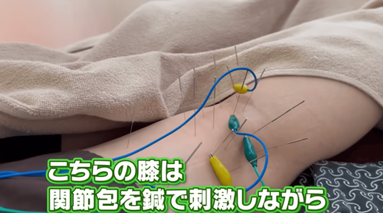 腰は温灸でたためて血流循環を良くします。腰は6cm鍼を刺し、膝は関節包を鍼で刺激しながら膝に水が溜まっているところを刺激して水の再吸収を狙っています。中の炎症が取れないと水が溜まるためホットパックで冷やしながら狙っていきます。