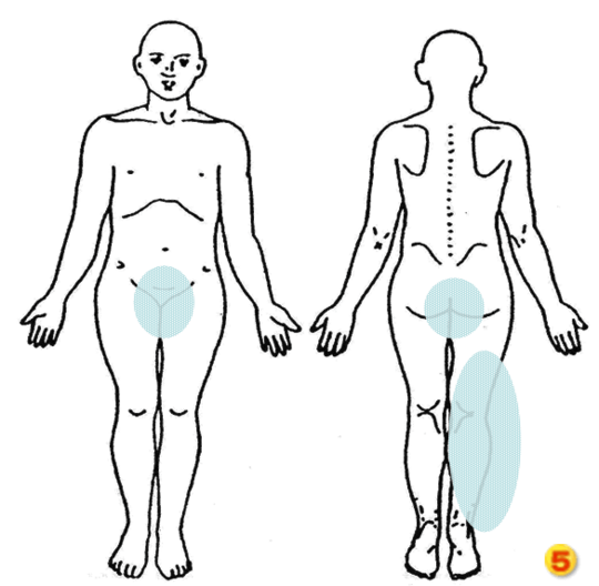 足のしびれに加え、陰部に痛みが出ているケースです。陰部神経が圧迫されており、陰茎と肛門に強いしびれを感じます。膀胱直腸障害のひとつで鍼灸が効かない症状です。