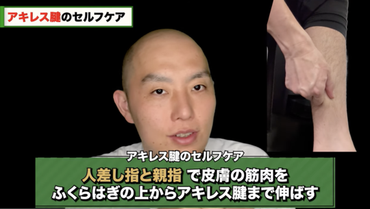ふくらはぎ周りの皮膚を伸ばし、ある程度走っても問題なければストレッチで伸ばします。その間アキレス腱を冷やすことも大事です。
