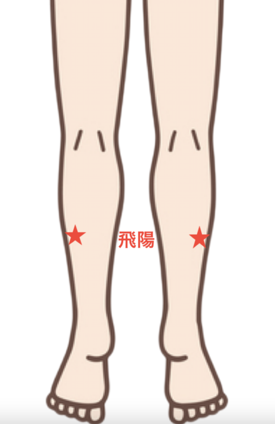 飛陽は、膝の痛みや足の痺れに効果的なツボです。背中や腰、太ももの裏側、ふくらはぎなどのむくみや疲れ、だるさに効果を発揮するとされています。