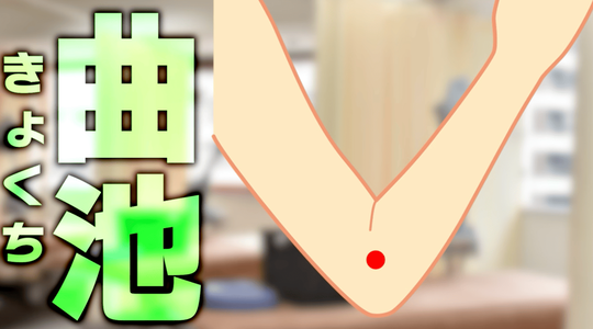 曲池の場所は、肘の関節部分の上側です。肘を曲げたときにできる横じわの延長上にあります。