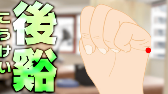 後谿は、鍼灸の現場ではぎっくり首や寝違いにも使われるツボです。昔から使われる効果の高いツボなので、ゆっくり息を吐きながら押してほしいです。押すと首が軽くなる感覚があります。これが体がリセットされる瞬間です。