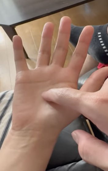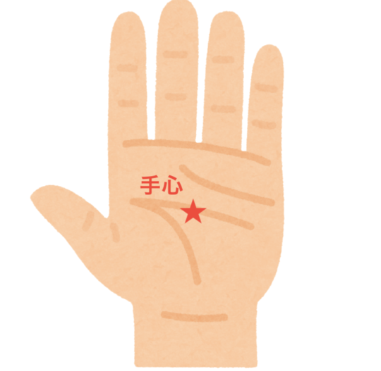 手心は、手のひらの中心にあるツボです。掌のちょうど真ん中あたりが1番凹んだところのポイントで押してあげると貧血がおさまりやすいです。