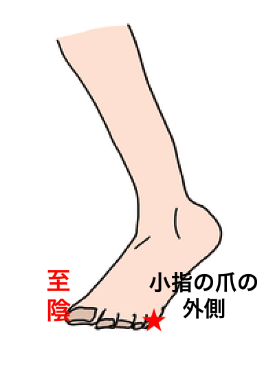 至陰は、足の小指の爪のすぐ下の外側にあるツボです。