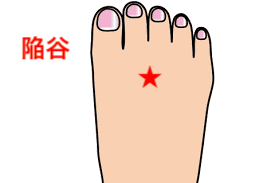 陥谷は、足の人差し指に続く骨と足の中指に続く骨の間にあるツボです。