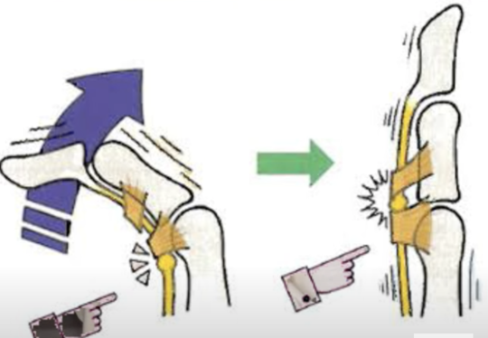 靭帯性腱鞘の中を潜って通っているため腫れているところが抜ける時にバネ指がおこります。この引っかかっているところが問題なのです。