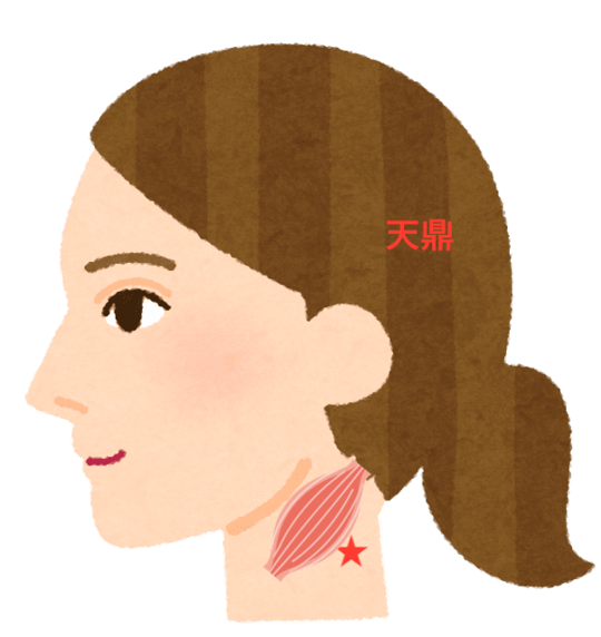 天鼎は喉仏のすぐ下の軟骨と同じ高さにあり、胸鎖乳突筋の後側のへりにあるツボです。