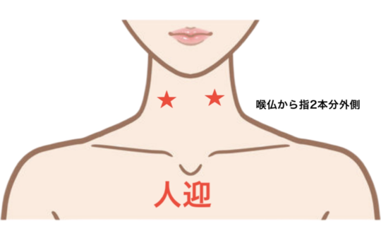 人迎は、喉仏の上へりと同じ高さにあり、胸鎖乳突筋の前側のへりにあるツボです。探すときは動脈の拍動を感じる場所を探しましょう。
