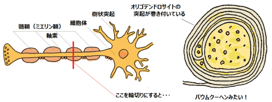 希突起膠細胞は、神経細胞の外側を覆う軸索を作り出す働きがありますが、この働きに異常をきたすため、神経の伝達機能に異常をきたします。