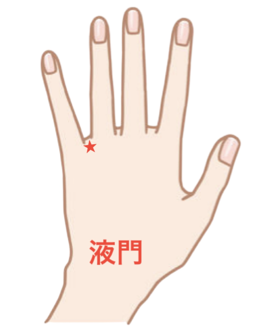 液門は、薬指と小指の間の関節の近くにあるツボです。探すときは、握りこぶしを作り、関節の谷間を探しましょう。