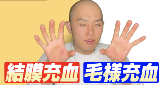 結膜充血は白目のあたりが赤くなってしまうこと、毛様充血は黒目の周りが赤くなってしまうことです。