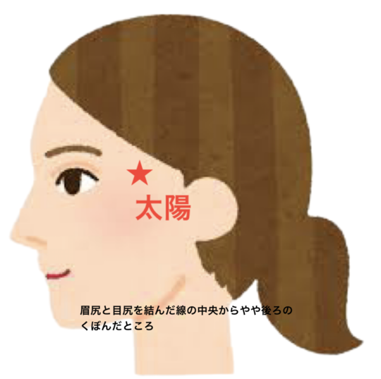 太陽は眉尻と目尻を結んだ線のこめかみあたりにあります。この辺りを刺激すると痛いところがあります。