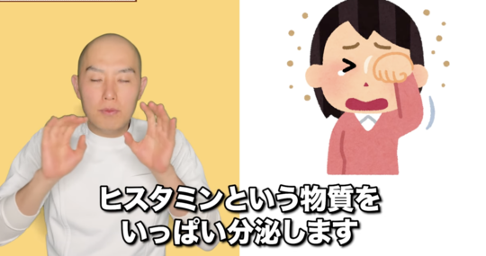 スギ花粉、檜、ハウスダスト、ダニなどのアレルゲンが体に入ってくると体の中の免疫細胞の肥満細胞という細胞がヒスタミンという物質をいっぱい分泌し症状が現れます。