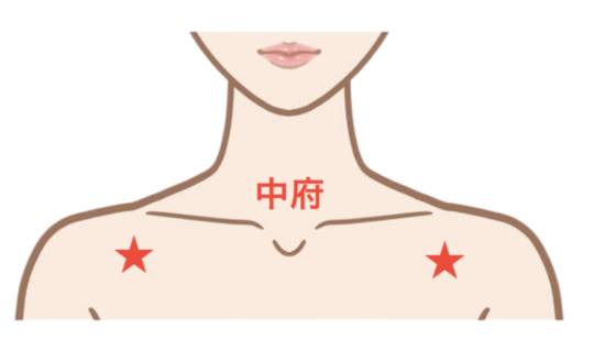 中府は、鎖骨の外端下のくぼみから指の幅1本分下へさがったところにあります。