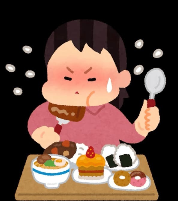 食べるものはアイスクリームやケーキなど脂肪を多く含んだ甘い食べ物を食べる傾向が強いです。食べ物の量は色々で、何千カロリーにも及ぶことがあります。さらに、1日のうちで何回も過食を繰り返すこともあります。