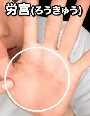 心を落ち着かせる1つ目のツボは手の真ん中にある労宮というツボです。強く押すと脳の興奮が下がりストレスが軽減します。
