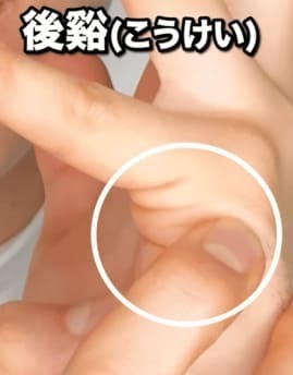 2つ目のツボは小指を曲げた時の関節の少し下の後渓というツボです。寝違いや精神安定に使うツボで、押すことで気持ちが休まり首こりや肩こりがやわらぎます。