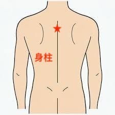 身柱は、頭を前に倒したときに、背骨の1番飛び出るところから背骨の盛り上がり3つ分下に下がったところにあります。