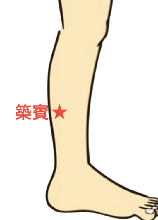 築賓は、ふくらはぎの内側にあるつぼです。内くるぶしから指5本分ほど上に上がったところにあります。
