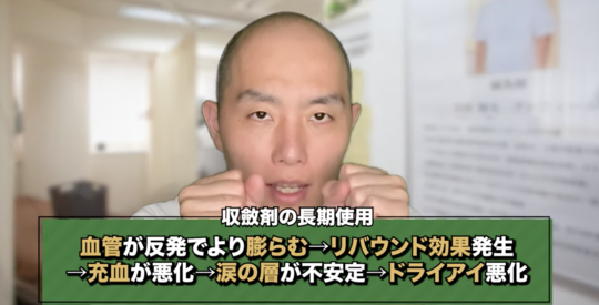 長期使用すると薬で縮めた血管が反発して膨らもうとするためリバウンド効果が発生し、充血がひどくなり涙の層が不安定になりドライアイがひどくなることがあります。