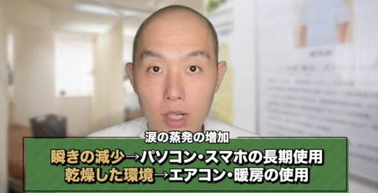パソコンやスマホの長期使用によって瞬きの減少、エアコンや暖房の使用によって乾燥した環境が原因で起こります。