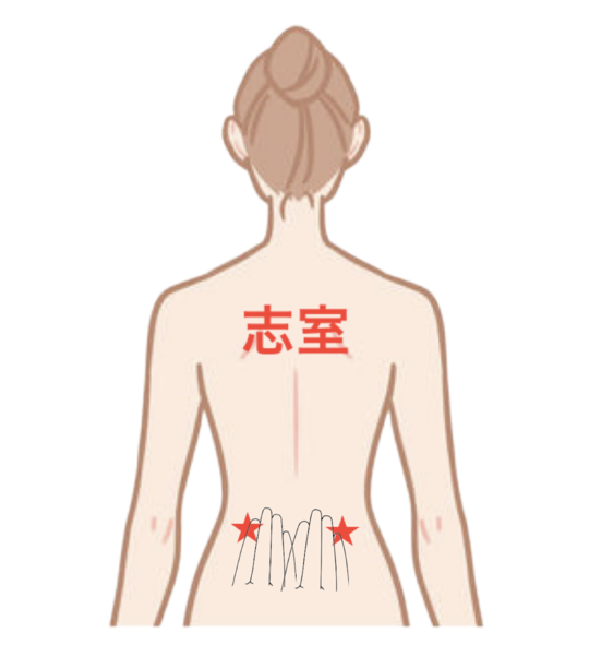 志室は、ウエストラインの背骨から左右に5cm進んだところにあります。探すときは、両手を開いて背中に回し腰に手を当ててさがしましょう。そのとき、親指が当たる場所にあります。
