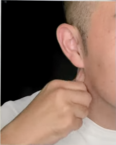 ①両手の人差し指、親指を使って首周りの皮膚を思いっきり引っ張ります。
