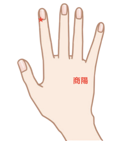 商陽は、人差し指の爪の付け根の親指よりの角で、押すとくぼむところにあります。