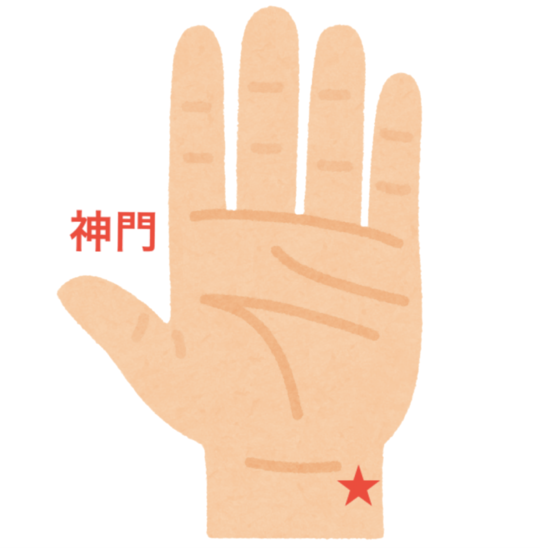 神門は、手首の横じわの小指側の少しのくぼみにあります。