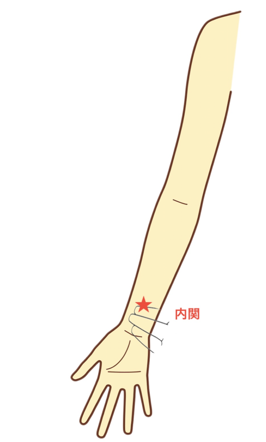 内関は、手のひらを上に向けた状態で探します。手と手首の境目にあるしわの真ん中から指3本分ひじ側にいったところにあります。