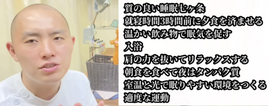 睡眠不足を避けて規則正しい睡眠リズムを作ることが大事です。体は睡眠中に変化していきます。変化する割合が少なかったり変化する時間が短かったりすると、良い方向に向かっていきません。