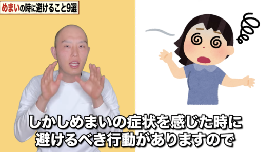 めまいの症状を感じた時には避けるべき行動があります。ここでは、その避けるべき行動9つを説明します。