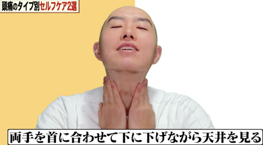 両手を首に合わせて下に下げながら天井を見るエクササイズを30秒、朝昼晩の1日3回行いましょう。首、喉、顎の隙間を開けることができます。