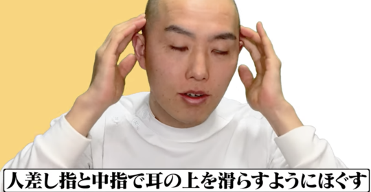 顔の筋肉をほぐすと筋緊張性頭痛は楽になりやすいため、人差し指と中指で耳の上を滑らすようにほぐしましょう。