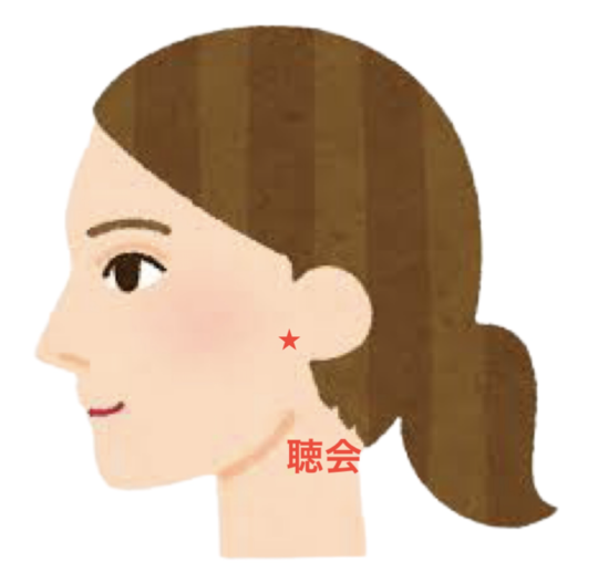 聴会は、耳珠の下のすぐ前で、下顎骨の後縁にあります。聴宮の少し下にあるツボなのです。
