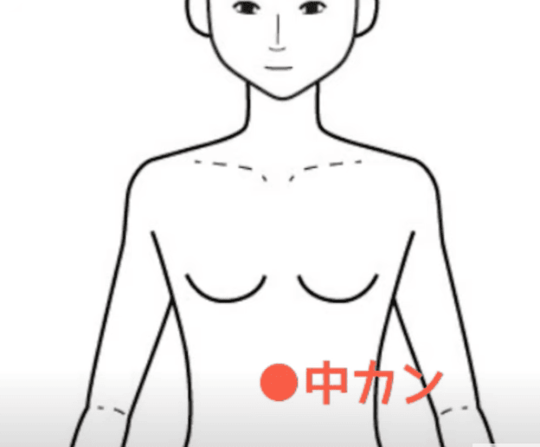 中脘はお腹の真ん中にあるツボで胃の働きを落ち着かせてくれるツボです。へそから2〜3センチ上にあります。