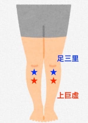 上巨虚は、足三里から下に指幅3〜4本分下がったところにあります。 上巨虚を押すときは、足三里を探し、上巨虚を探すと良いでしょう。