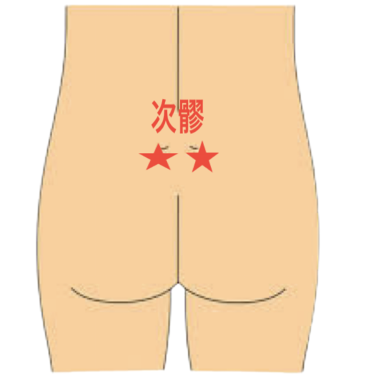 次髎は、骨盤や臓器の血流に関係しているツボです。そのため、排尿障害や生殖器の問題、腰痛や冷え性などに効果的です。