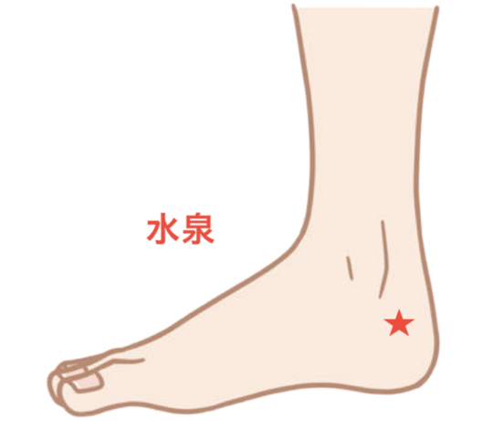 水泉は、かかとと内くるぶしを結んだ線の中間にある骨のへこみにあります。