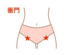 衝門の場所は足の付け根で、バストトップからまっすぐ下に下がったところにあります。動脈の拍動を感じる部分の外側が衝門のある場所です。