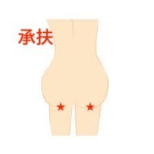 承扶は、まっすぐ立ったときにできる、おしりの下の横じわ中央にあります。お尻と太ももの境にあるお尻の溝の真ん中にあります。