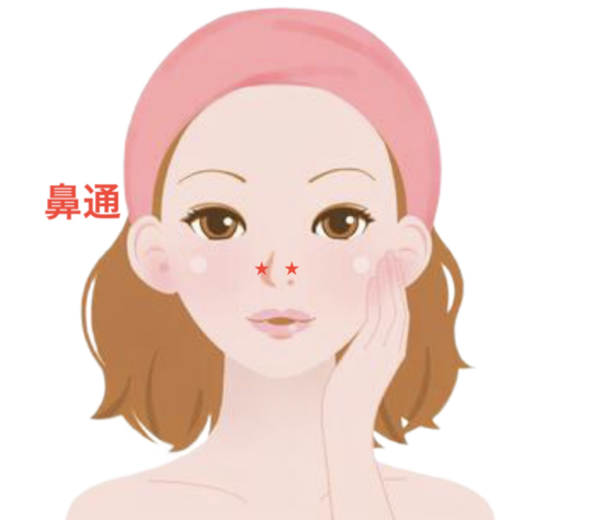 鼻通は、小鼻のすぐ横にあるくぼみにあり、左右両方あるツボです。 迎香の少し上にあると覚えましょう。