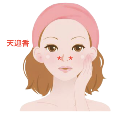 天迎香は、小鼻のつけ根の脇にあり、左右両方あるツボです。 迎香の上にあると覚えると覚えやすいです。