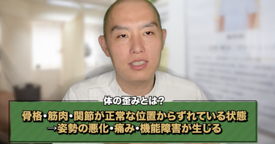 体の歪みとは、骨格や筋肉、関節が正常な位置からずれている状態を指します。そのことによって姿勢の悪化、痛み、機能障害が生じることがあるのです。