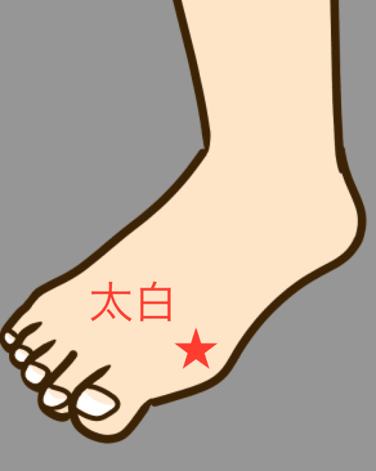 太白は、足の親指を曲げてできるシワのかかと側にあります。探すときは、足の親指の内側からかかとに向かう延長線上をたどったとき、親指の位置から初めにあるへこみを探しましょう。