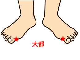 大都は、足の親指を曲げた時にできるシワの親指側にあります。