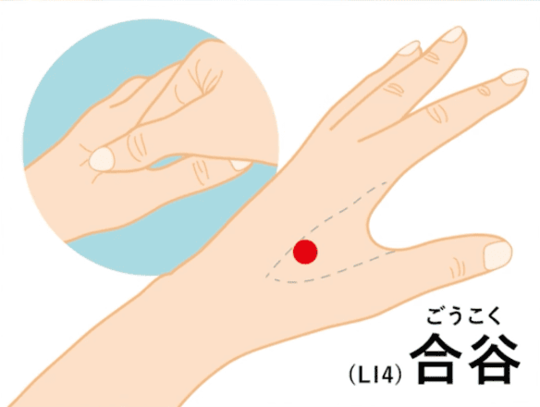 それに加えて合谷もぐりぐりしましょう。親指と人差し指の間にある合谷は古来より緊張緩和の要所とされています。神経反射を通じて脳に安心せよという信号を送るのです。