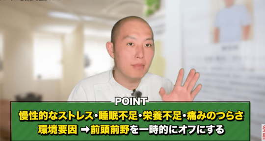 扁桃体にブレーキをかける役割を持つのが前頭前野です。前頭前野は脳の前側にある部分で理性的に判断をして感情の暴走を抑制してくれます。しかし、慢性的なストレスや睡眠不足、栄養不足、痛みの辛さ、環境要因などが前頭前野に影響を及ぼし一時的にオフになることがあります。
